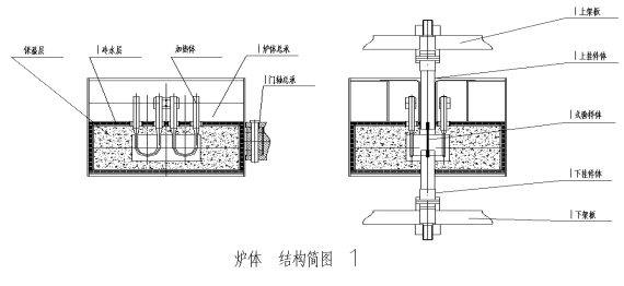 1)高溫爐體 為了讓用戶方便安全的更換試樣,采用水冷、可移動、對開式的爐體結(jié)構(gòu)(具體見簡圖1).爐體及爐蓋采用雙層不銹鋼的焊接結(jié)構(gòu),總厚度約為15mm,中空通流動水。具有開門斷電功能。